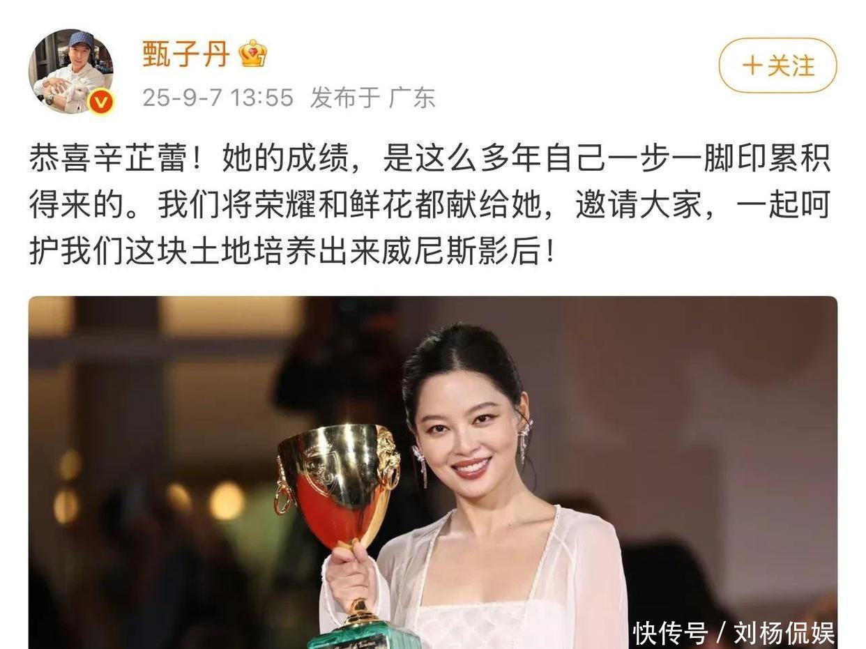获奖讯息公布今日,武打演员甄子丹坐窝发来了道喜,他在辛芷蕾的酬酢平台评陈诉:她的配置王人是靠我方一步步努力得来的,我们得好好爱戴这位从咱这片地盘上成长起来的影后。