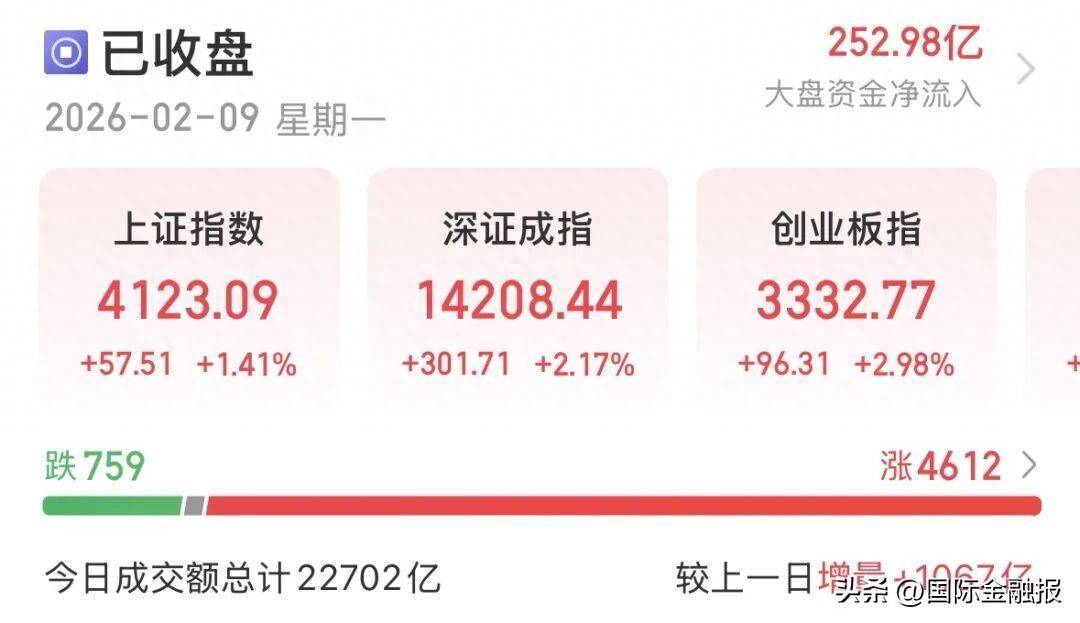 2月9日欧洲杯体育,A股迎来普涨行情,双创指数涨近3%,4612只个股收红,光通讯模块、影视想法等板块涨幅靠前。