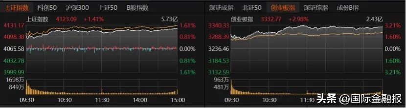 指数高开高走,沪指收涨1.41%报4123.09点,创业板指收涨2.98%报3332.77点,深证成指收涨2.17%。沪深300、上证50、北证50涨幅均进步1%,科创50收涨2.51%。