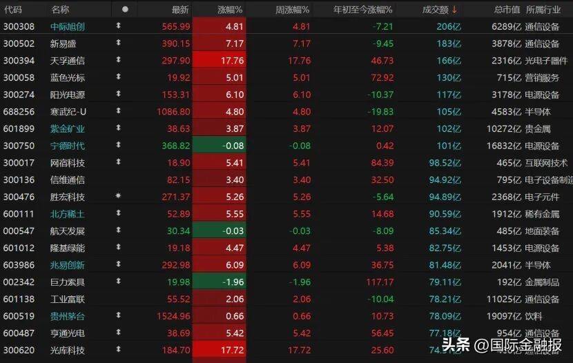市集揣度4612只个股收涨,涨停96只;759只个股收跌,跌停8只。往返活跃股方面,日成交额超100亿元的个股共8只,CPO想法龙头股“易中天”集体大涨,中际旭创收涨4.81%报565.99元/股,新易盛收涨7.17%报390.15元/股,天孚通讯收涨17.76%报297.9元/股。蓝色光标、阳光电源、寒武纪-U、紫金矿业涨幅亦较为可不雅。