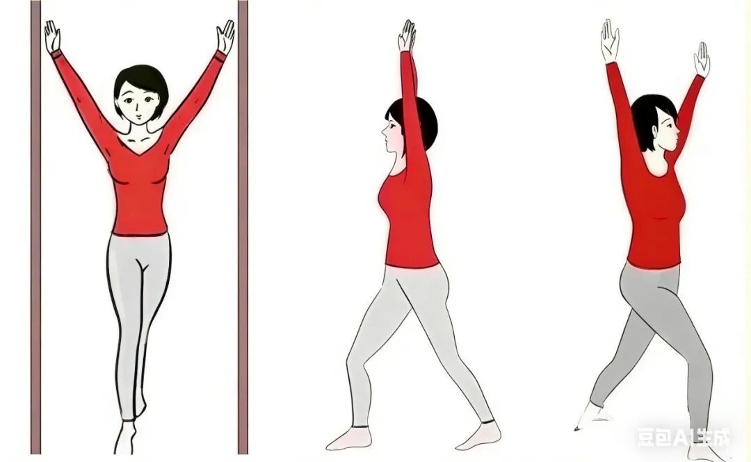 诳骗自家或办公室的门框,双手扶住两侧门框,形体与门框平行,头直立,两眼上前平视;一脚在前,站弓步,另一脚在后,腿尽量伸直;使劲伸展双臂,直至有紧绷感,以此姿势耸立3分钟,然后再换一条腿站弓步3分钟。