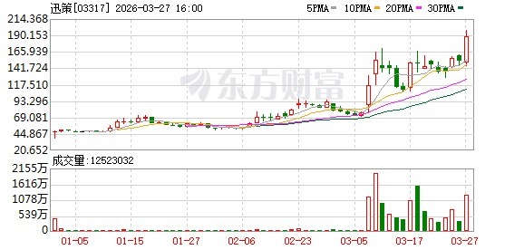 3月27日,被市集称为“词元龙头股”的迅策(03317.HK)再次大涨,盘中最热潮幅朝上29%,创下历史新高。当日报收于188.6港元/股,涨幅为24.26%,总市值攀升至608亿港元。