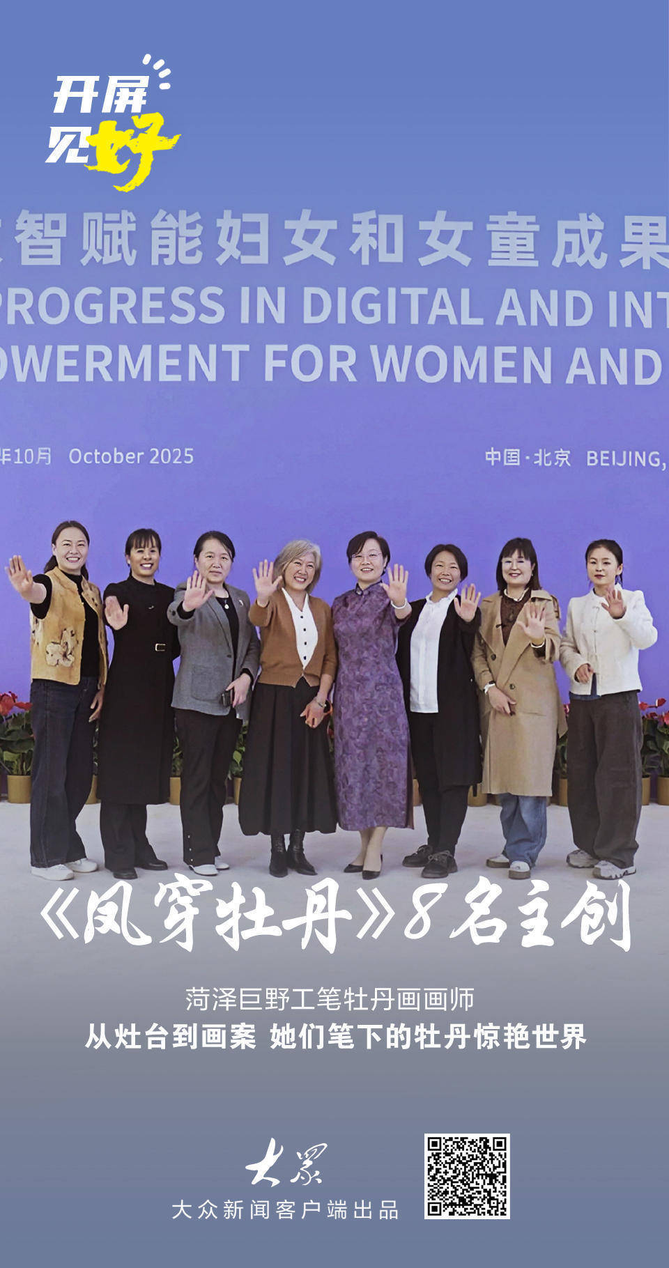 时辰回溯到昨年10月,《凤穿牡丹》在全球妇女峰会配套行径“数智赋能妇女和女童效果展”现场亮相。画作前,几位气质千里静的中国女性笑貌温婉,与画中的华彩交相照映——她们恰是这幅画的主创:李巧玲、张雪云、常秀娟、洪晓雁、田琳琳、裴薇薇、张玉梅、胡咏梅。